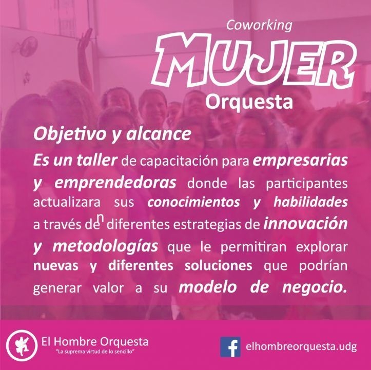 Coworking Mujer Orquesta es un taller de capacitación especialmente pensado para mujeres empresarias y emprendedoras en donde las participantes tendrás la oportunidad de aprender, actualizar conocimientos y habilidades empresariales practicas a través de diferentes estrategias de innovación y metodologías que le permitirán conocer y explorar nuevas y diferentes ideas y soluciones que podrían generar valor a su modelo de negocio,